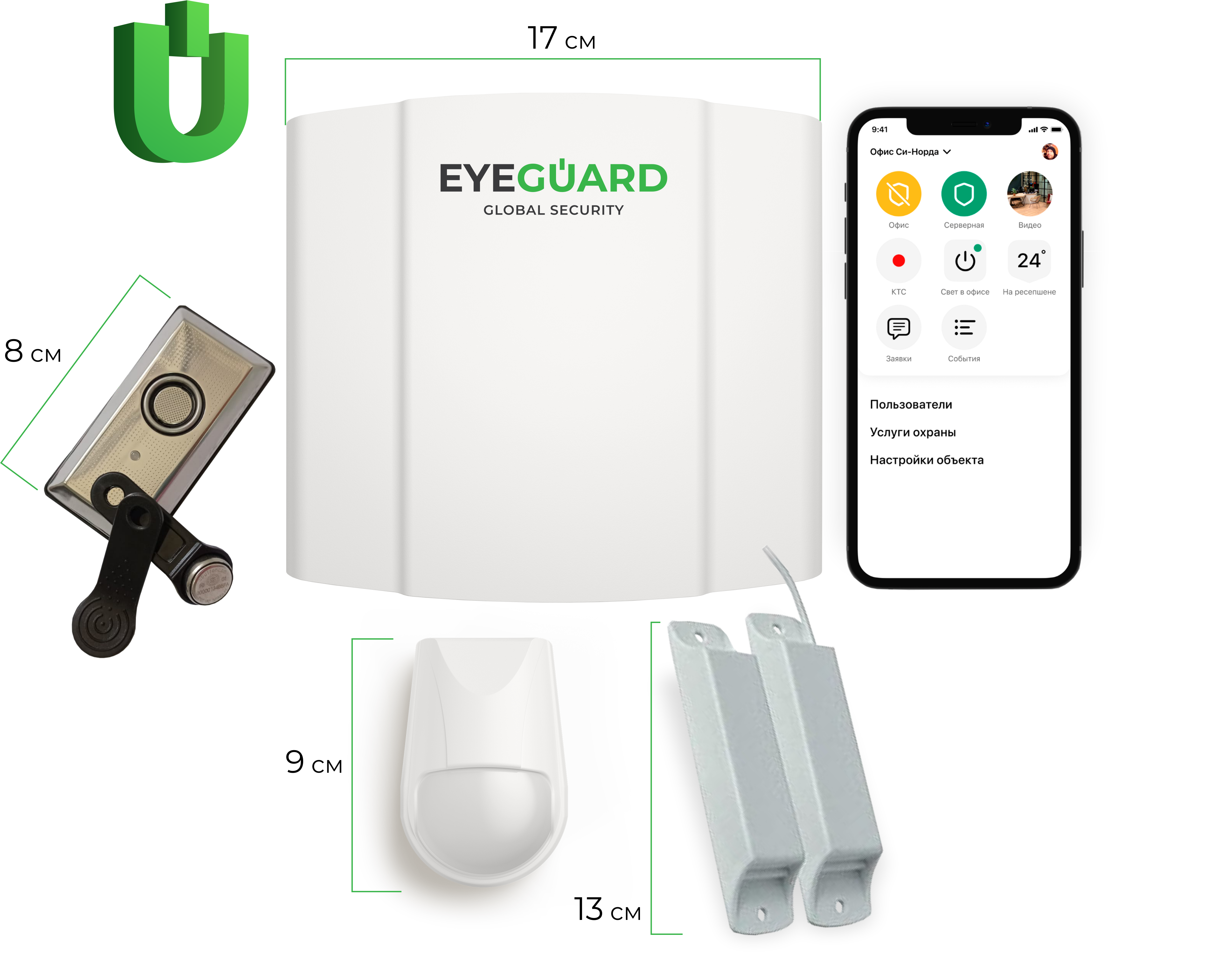 Пакет "Минимум". Подходит для начинающих предпринимателей малого бизнеса. Базовый комплект проводной охранной сигнализации. Вход осуществляется через считыватель, с приложением магнитного ключика.